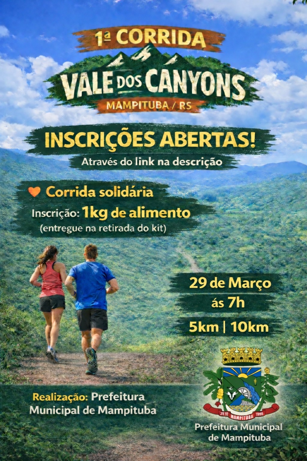 AdministraçãoDestaquesEsportesTurismo e Meio AmbienteÚltimas Notícias 1ª Corrida Vale dos Canyons By Assessoria de Comunicação - 20 de fevereiro de 2026 0 26 Share on Facebook Tweet on Twitter Para realizar sua inscrição, clique aqui.