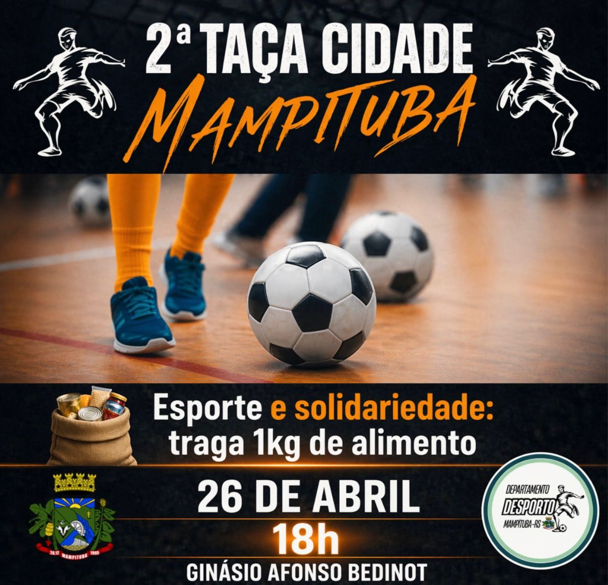 A Administração Municipal de Mampituba, por meio do Departamento de Desporto, realiza neste domingo, dia 26 de abril, a abertura oficial da 2ª Taça Cidade de Mampituba. A programação inicia às 18h, no Ginásio Afonso Bedinot, com uma sequência de jogos em diferentes categorias.