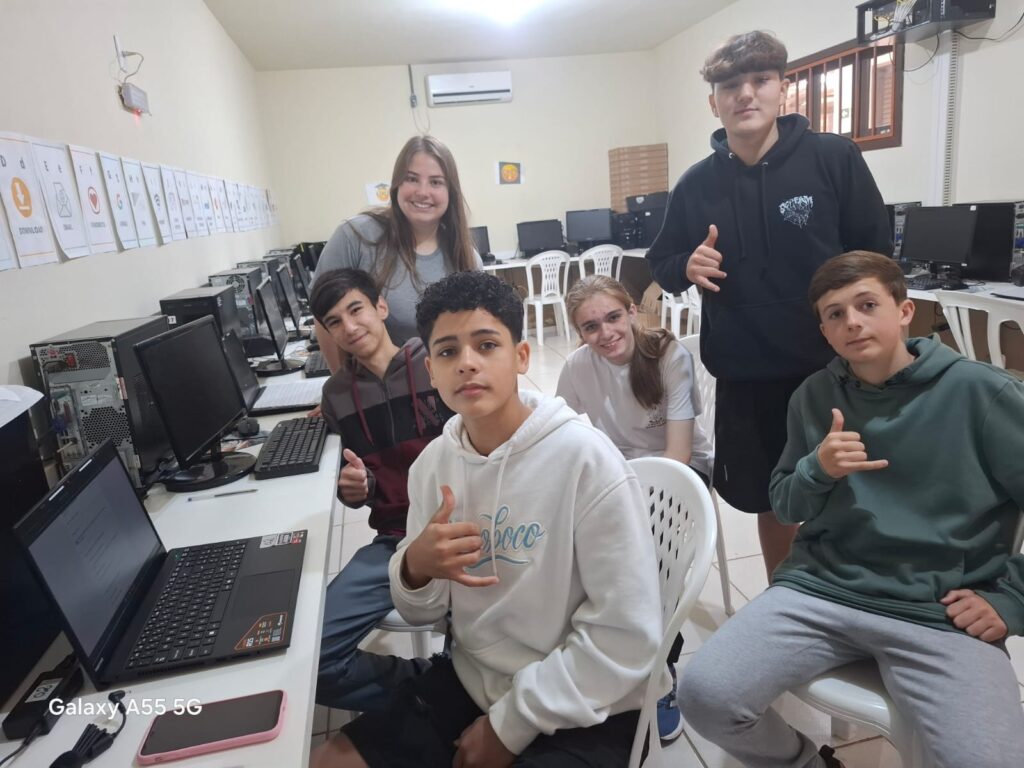 Ainda na mesma escola, os alunos Thomaz, Henrique, João Vitor, Pedro e Lucas, do 8º ano, reuniram-se com a Professora Katrine para representar o município no Desafio Intermunicipal de Educação Fiscal, apresentando uma paródia criativa sobre o tema.