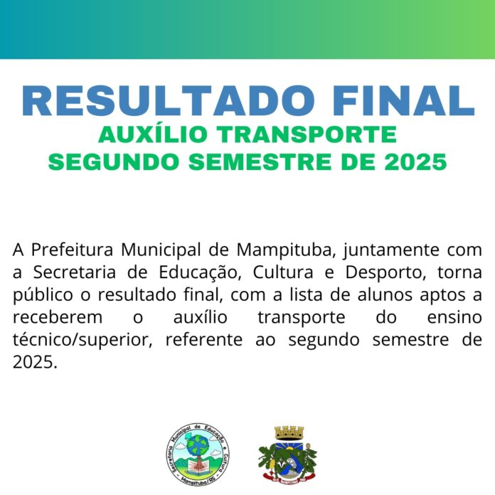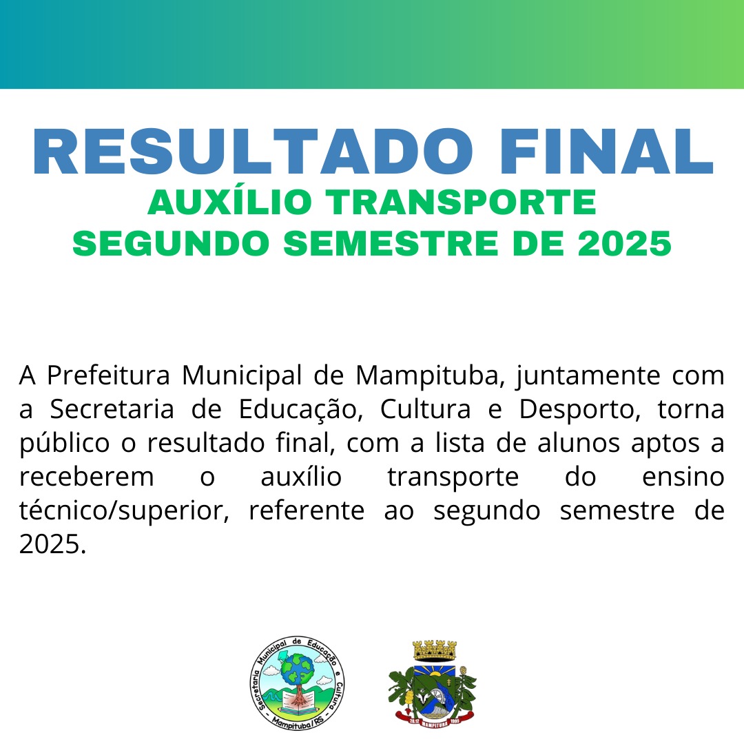 DestaquesSaúde e EducaçãoÚltimas Notícias LISTA FINAL DE ALUNOS APTOS A RECEBEREM O AUXÍLIO TRANSPORTE PARA O ENSINO TÉCNICO/SUPERIOR, REFERENTE AO SEGUNDO SEMESTRE DE 2025 By Assessoria de Comunicação - 10 de dezembro de 2025 0 16 Share on Facebook Tweet on Twitter Para acessar a lista, clique aqui.